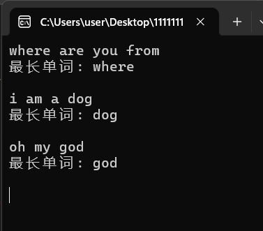 /* 输入一行英文文本,统计最长单词,并打印输出。 为简化问题,只考虑单词之间用空格间隔的情形。 相较于教材例5.24,做了以下改动: 1. 增加了多组输入,因此,一些变量初始化放到了第一层循环里面 2. 微调了代码书写逻辑和顺序 */ #include <stdio.h> #define N 1000 int main() { char line[N]; int word_len; // 记录当前单词长度 int max_len; // 记录最长单词长度 int end; // 记录最长单词结束位置 int i; while(gets(line) != NULL) { word_len = 0; max_len = 0; end = 0; i = 0; while(1) { // 跳过连续空格 while(line[i] == ' ') { word_len = 0; // 单词长度置0,为新单词统计做准备 i++; } // 在一个单词中,统计当前单词长度 while(line[i] != '\0' && line[i] != ' ') { word_len++; i++; } // 更新更长单词长度,并,记录最长单词结束位置 if(max_len < word_len) { max_len = word_len; end = i; // end保存的是单词结束的下一个坐标位置 } // 遍历到文本结束时,终止循环 if(line[i] == '\0') break; } // 输出最长单词 printf("最长单词: "); for(i = end - max_len; i < end; ++i) printf("%c", line[i]); printf("\n\n"); } return 0; }