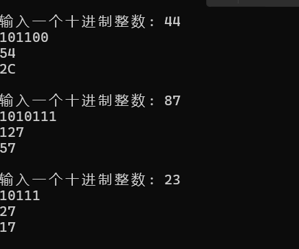 1 #include <stdio.h> 2 #define N 100 3 void dec_to_n(int x, int n); // 函数声明 4 5 int main() { 6 int x; 7 8 printf("输入一个十进制整数: "); 9 while(scanf("%d", &x) != EOF) { 10 dec_to_n(x, 2); // 函数调用: 把x转换成二进制输出 11 dec_to_n(x, 8); // 函数调用: 把x转换成八进制输出 12 dec_to_n(x, 16); // 函数调用: 把x转换成十六进制输出 13 14 printf("\n输入一个十进制整数: "); 15 } 16 17 return 0; 18 } 19 20 // 函数定义 21 // 功能: 把十进制数x转换成n进制,打印输出 22 // 补足函数实现 23 // ××× 24 void dec_to_n(int x, int n){ 25 char ans[N]; 26 char map[16]="0123456789ABCDEF"; 27 28 int d,r; 29 int cnt,i; 30 31 cnt=0; 32 while(1) { 33 d=x/n; 34 r=x%n; 35 ans[cnt++]=map[r]; 36 37 if(d==0) 38 break; 39 40 x=d; 41 } 42 for(i=cnt-1;i>=0;--i) 43 printf("%c",ans[i]); 44 printf("\n"); 45 }