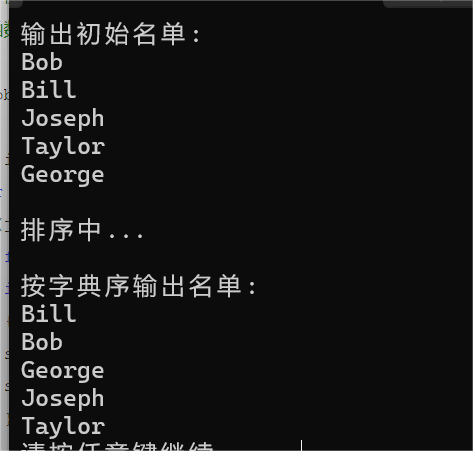 1 #include <stdio.h> 2 #include <string.h> 3 4 #define N 5 5 #define M 20 6 7 // 函数声明 8 void output(char str[][M], int n); 9 void bubble_sort(char str[][M], int n); 10 11 int main() { 12 char name[][M] = {"Bob", "Bill", "Joseph", "Taylor", "George"}; 13 int i; 14 15 printf("输出初始名单:\n"); 16 output(name, N); 17 18 printf("\n排序中...\n"); 19 bubble_sort(name, N); // 函数调用 20 21 printf("\n按字典序输出名单:\n"); 22 output(name, N); 23 return 0; 24 } 25 26 // 函数定义 27 // 功能:按行输出二维数组中的字符串 28 void output(char str[][M], int n) { 29 int i; 30 31 for(i = 0; i < n; ++i) 32 printf("%s\n", str[i]); 33 } 34 35 // 函数定义 36 // 功能:使用冒泡排序算法对二维数组str中的n个字符串按字典序排序 37 // 补足函数bubble_sort()实现 38 // ××× 39 void bubble_sort(char str[][M], int n){ 40 int i, j; 41 char tmp[M]; 42 43 for(i = 0; i < n-1; ++i) { 44 for(j = 0; j < n-i-1; ++j) { 45 if(strcmp(str[j], str[j+1]) > 0) { 46 strcpy(tmp, str[j]); 47 strcpy(str[j], str[j+1]); 48 strcpy(str[j+1], tmp); 49 } 50 } 51 } 52 }