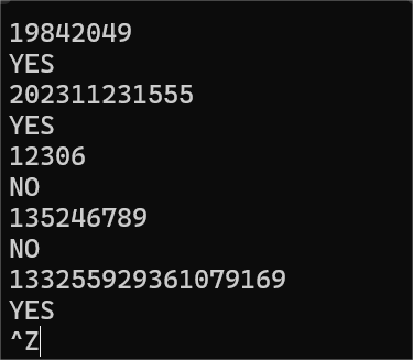 #include <stdio.h> #define N 105 int is_repeated(char x[]); int main(){ char num[N]; while(scanf("%s",&num) != EOF){ if(is_repeated(num)==1) printf("YES\n"); else printf("NO\n"); } return 0; } int is_repeated(char x[]){ int cnt[10]={0}; int i,j; for(i=0;x[i]!='\0';i++){ j= x[i]- '0'; cnt[j]++; if(cnt[j]>1) return 1; } return 0; }