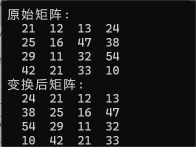 1 #include <stdio.h> 2 #define N 100 3 #define M 4 4 5 6 void output(int x[][N], int n); 7 void rotate_to_right(int x[][N], int n); 8 9 10 int main() { 11 int t[][N] = {{21, 12, 13, 24}, 12 {25, 16, 47, 38}, 13 {29, 11, 32, 54}, 14 {42, 21, 33, 10}}; 15 16 printf("原始矩阵:\n"); 17 output(t, M); 18 19 rotate_to_right(t, M); 20 21 printf("变换后的矩阵:\n"); 22 output(t, M); 23 24 return 0; 25 } 26 27 void rotate_to_right(int x[][N], int n){ 28 int i,j; 29 int t[M][N]; 30 for(i=0;i<n;++i){ 31 t[i][n-1]=x[i][n-1]; 32 for(j=0;j<n;++j){ 33 x[i][n-1-j]=x[i][n-2-j]; 34 } 35 x[i][0]=t[i][n-1]; 36 } 37 38 39 } 40 41 void output(int x[][N], int n) { 42 int i, j; 43 44 for (i = 0; i < n; ++i) { 45 for (j = 0; j < n; ++j) 46 printf("%4d", x[i][j]); 47 48 printf("\n"); 49 } 50 }