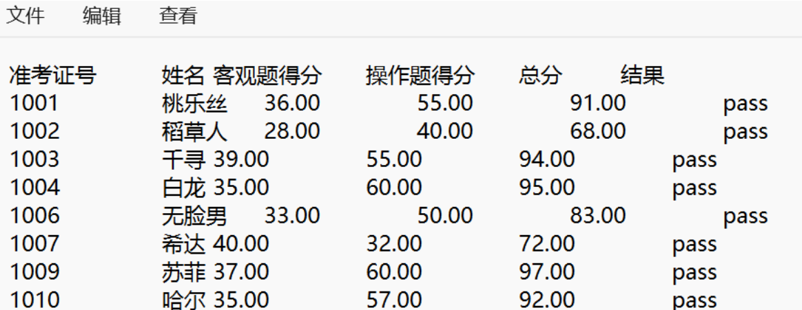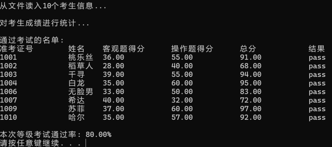 1 #include <stdio.h> 2 #include <string.h> 3 #include <stdlib.h> 4 5 #define N 10 6 7 typedef struct { 8 long int id; 9 char name[20]; 10 float objective; // 客观题得分 11 float subjective; // 操作题得分 12 float sum; // 总分 13 char ans[10]; // 考试结果 14 } STU; 15 16 // 函数声明 17 void finput(STU st[], int n); 18 void foutput(STU st[], int n); 19 void output(STU st[], int n); 20 int process(STU st[], int n, STU st_pass[]); 21 22 int main() { 23 STU stu[N], stu_pass[N]; 24 int cnt; 25 double pass_rate; 26 27 printf("从文件读入%d个考生信息...\n", N); 28 finput(stu, N); 29 30 printf("\n对考生成绩进行统计...\n"); 31 cnt = process(stu, N, stu_pass); 32 33 printf("\n通过考试的名单:\n"); 34 output(stu_pass, cnt); // 输出到屏幕 35 foutput(stu_pass, cnt); // 输出到文件 36 37 pass_rate = 1.0 * cnt / N; 38 printf("\n本次等级考试通过率: %.2f%%\n", pass_rate*100); 39 system("pause"); 40 return 0; 41 } 42 43 // 把通过考试的考生完整信息输出到屏幕上 44 // 准考证号,姓名,客观题得分,操作题得分,总分,结果 45 void output(STU st[], int n) { 46 int i; 47 48 printf("准考证号\t姓名\t客观题得分\t操作题得分\t总分\t\t结果\n"); 49 for (i = 0; i < n; i++) 50 printf("%ld\t\t%s\t%.2f\t\t%.2f\t\t%.2f\t\t%s\n", st[i].id, st[i].name, st[i].objective, st[i].subjective, st[i].sum, st[i].ans); 51 } 52 53 // 从文本文件examinee.txt读入考生信息:准考证号,姓名,客观题得分,操作题得分 54 void finput(STU st[], int n) { 55 int i; 56 FILE *fin; 57 58 fin = fopen("examinee.txt", "r"); 59 if (fin == NULL) { 60 printf("fail to open file\n"); 61 exit(0); 62 } 63 64 while (!feof(fin)) { 65 for (i = 0; i < n; i++) 66 fscanf(fin, "%ld %s %f %f", &st[i].id, st[i].name, &st[i].objective, &st[i].subjective); 67 } 68 69 fclose(fin); 70 } 71 72 // 把通过考试的考生完整信息写入文件list_pass.txt 73 // 准考证号,姓名,客观题得分,操作题得分,总分,结果 74 void foutput(STU s[], int n) { 75 FILE *fout; 76 int i; 77 78 // 保存到文件 79 fout = fopen("list_pass.txt", "w"); 80 if (!fout) { 81 printf("fail to open or create list_pass.txt\n"); 82 exit(0); 83 } 84 85 fprintf(fout, "准考证号\t\t姓名\t客观题得分\t操作题得分\t总分\t\t结果\n"); 86 87 for (i = 0; i < n; i++) 88 fprintf(fout, "%ld\t\t%s\t%.2f\t\t%.2f\t\t%.2f\t\t%s\n", s[i].id, s[i].name, s[i].objective, s[i].subjective, s[i].sum, s[i].ans); 89 90 fclose(fout); 91 } 92 93 // 对考生信息进行处理:计算每位考生考试总分、结果;统计考试通过的人数 94 int process(STU st[], int n, STU st_pass[]) { 95 // 待补足 96 // ××× 97 int i,j = 0; 98 99 for (i = 0; i < n; i++){ 100 st[i].sum = st[i].objective + st[i].subjective; 101 if(st[i].sum >= 60){ 102 strcpy(st[i].ans,"pass"); 103 st_pass[j] = st[i]; 104 j++; 105 } 106 else 107 strcpy(st[i].ans,"fail"); 108 } 109 system("pause"); 110 return j; 111 }