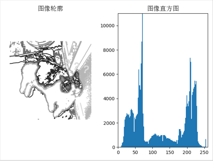 图像的直方图用来表征该图像像素值的分布情况。用一定数目的小区间(bin)来指定表征像素值的范围,每个小区间会得到落入该小区间表示范围的像素数目。图像的直方图可以使用 hist() 函数绘制。hist() 函数的第二个参数指定小区间的数目。需要注意的是,因为 hist() 只接受一维数组作为输入,所以我们在绘制图像直方图之前,必须先对图像进行压平处理。flatten() 方法将任意数组按照行优先准则转换成一维数组。