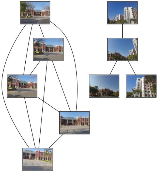 # 可视化 threshold = 2 # min number of matches needed to create link g = pydot.Dot(graph_type='graph') # don't want the default directed graph for i in range(nbr_images): for j in range(i + 1, nbr_images): if matchscores[i, j] > threshold: # first image in pair im = Image.open(imlist[i]) im.thumbnail((100, 100)) filename = path + str(i) + '.jpg' im.save(filename) # need temporary files of the right size g.add_node(pydot.Node(str(i), fontcolor='transparent', shape='rectangle', image=filename)) # second image in pair im = Image.open(imlist[j]) im.thumbnail((100, 100)) filename = path + str(j) + '.jpg' im.save(filename) # need temporary files of the right size g.add_node(pydot.Node(str(j), fontcolor='transparent', shape='rectangle', image=filename)) g.add_edge(pydot.Edge(str(i), str(j))) g.write_jpg('1.jpg')