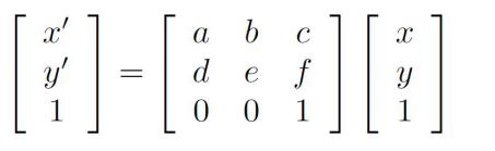 由于仿射变换具有6个自由度,所以需要三个对应点来估计矩阵H。其中X和Y为原坐标,X’和Y’为变换后的坐标,a~f为6个自由度,其中c、f参数分别为x方向和y方向的平移向量。