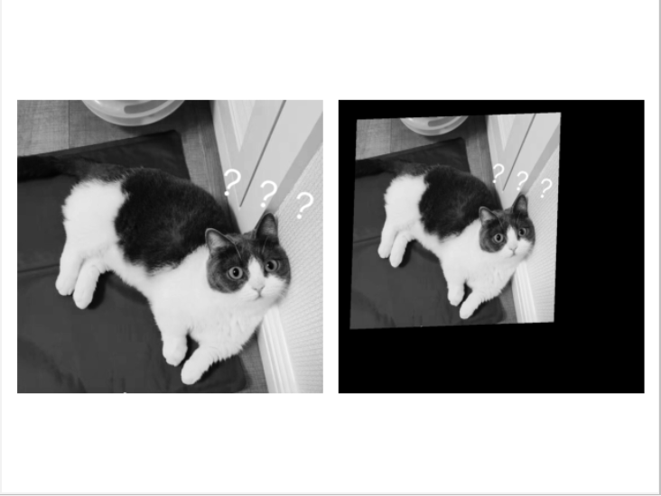 from array import array from numpy import * from matplotlib.pyplot import * from scipy import ndimage from PIL import Image im = array(Image.open(r'C:\Users\yifan\Pictures\cat.jpg').convert('L')) H = array([[1.4,0.05,-100],[0.05,1.5,-100],[0,0,1]]) im2 = ndimage.affine_transform(im, H[:2,:2],(H[0,2],H[1,2])) gray() subplot(121) imshow(im) axis('off') subplot(122) imshow(im2) axis('off') show()