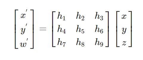 单应性变换是将一个平面内的点映射到另一个平面内的二维投影变换。这里的平面是指图像或者三维中的平面表示。单应性变换具有很强的实用性,比如图像配准,图像纠正和纹理扭曲,以及创建全景图像,我们将频繁的使用单应性变换。本质上,单应性变换H,按照下面的方程映射二维中的点(齐次坐标意义下):