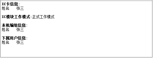 mICCardMsg = QStringLiteral("姓名 张三"); mLocalGroupMsg = QStringLiteral("姓名 张三"); mLowUserMsg = QStringLiteral("姓名 张三"); //更新表格 ui.textEdit->clear(); ui.textEdit->insertHtml(QStringLiteral("<p style='margin:0px;padding:0px;'><strong>IC卡信息:</strong> </p>")); ui.textEdit->append(mICCardMsg); ui.textEdit->append(""); ui.textEdit->append(""); ui.textEdit->insertHtml(QStringLiteral("<p style='margin:0px;padding:0px;'><strong>IC模块工作模式:</strong>") + mWorkModeMsg + QString("</p>")); ui.textEdit->append(""); ui.textEdit->append(""); ui.textEdit->insertHtml(QStringLiteral("<p style='margin:0px;padding:0px;'><strong>本机编组信息:</strong> </p>")); ui.textEdit->append(mLocalGroupMsg); ui.textEdit->append(""); ui.textEdit->append(""); ui.textEdit->insertHtml(QStringLiteral("<p style='margin:0px;padding:0px;'><strong>下属用户信息:</strong> </p>")); ui.textEdit->append(mLowUserMsg); ui.textEdit->append(""); //滚动条设置到顶部 ui.textEdit->verticalScrollBar()->setValue(0);