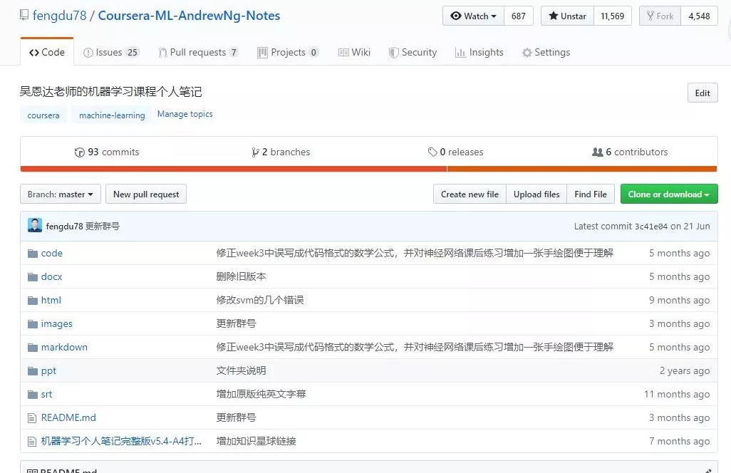 在学习机器学习课程时,我发现看视频有点累,就边看边写笔记,大概写了三个月,写了差不多了,我在mooc学院发个帖子给大家下载。后来我也忘了发帖这个事情了,直到博二下学期有人发邮件告诉我链接失效了,我才发现笔记已经被下载了7000多次了,然后被百度云和谐了。我觉得笔记应该帮助了不少人,给了我继续修改完善笔记的动力,一直断断续续改了两年,期间收到几千封感谢邮件,后来我把笔记放到了github上提供下载,被下载了几十万次,获得11500+star。原课程的作业代码是octave的,现在几乎用不到了,我用python3.6复现了课程代码,并且公开了笔记的word和markdown版本。
