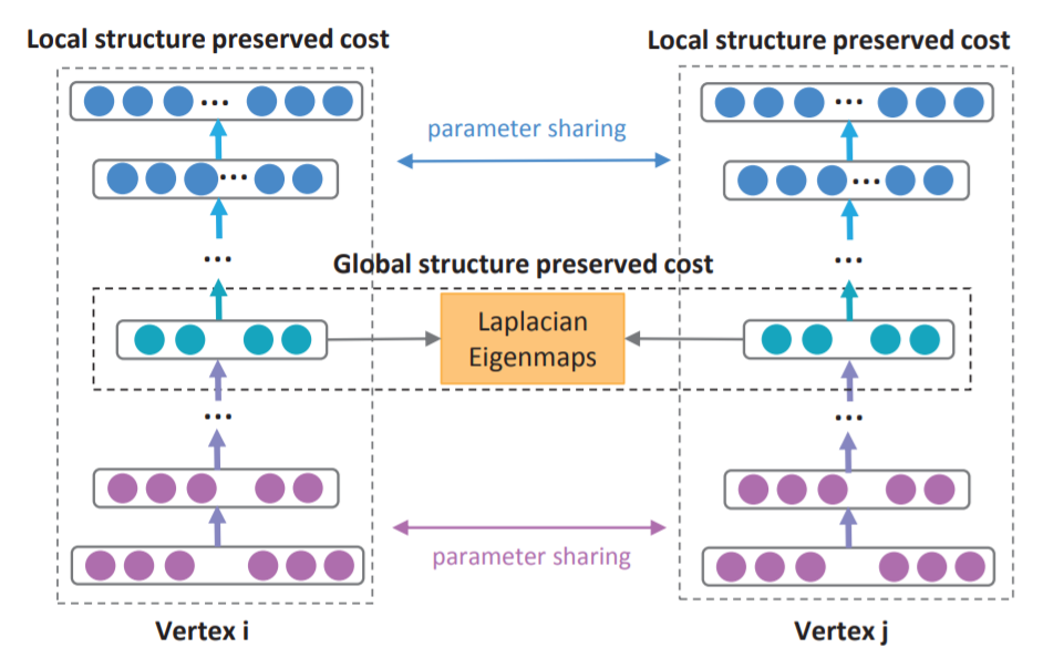 其中如果A(i, j)= 0则b[ij] = 1,否则bij = β > 1,β是另一个超参数。 SDNE 的整体架构如图 7 所示。