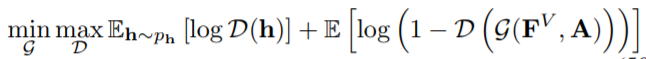 其中G(F^V, A)是方程 45 中的卷积编码器,D(·)是具有交叉熵损失的鉴别器,p[h]是先验分布。本文采用简单的高斯先验,实验结果证明了对抗训练方案的有效性。