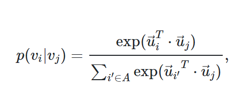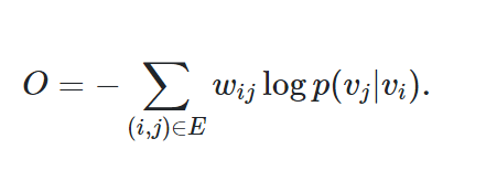 其中d(·,·)是两个分布之间的 KL 散度,λ[j]是网络中顶点v[j]的重要性,可以设置为deg[j]=Σi(w[ij]),并且经验分布可以定义为^p(v[i]|v[j]) = w[ij]/deg[j]。 省略一些常量,目标函数(2)可以计算为: