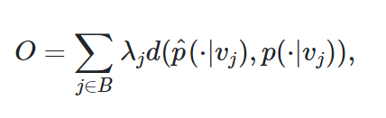 其中u[i]是V[A]中顶点v[i]的嵌入向量,u[j]是V[B]中顶点v[j]的嵌入向量。 对于V[B]中的每个顶点v[j],公式(1)定义了集合V[A]中所有顶点上的条件分布p(·| v[j]); 对于每对顶点v[j], v[j'],二阶邻近度实际上可以通过它们的条件分布p(·| v[j]),p(·| v[j'])来确定。 为了保留二阶邻近度,我们可以使条件分布p(·| v[j])接近其经验分布^p(·| v[j]),这可以通过最小化以下目标函数来实现:
