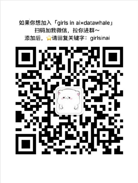 club 群初期将会是和 datawhale 合作的微信群。之前一直没有开微信群,是因为没有管理资源(因为累哦)。目前我已经受邀加入@datawhale,按触了对接人范大大之后,真的是很让人欣赏。datawhale 本身也是一个年轻充满 passion 的组织,很受鼓舞。接下来 datawhale 的 female coders 和 Giaers 都可以陆陆续续加入进来,作为 GIA 的第个官方群哦!终于来惹!加入的方式将在另外一张二维码图里。