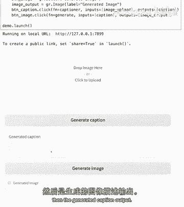 生成字幕的captioner,接受图像生成字幕,generate函数,接受文本生成图像,开始吧,导入gra,构建简单的字幕应用,可以看到上传图像,生成字幕,生成的字幕输出。