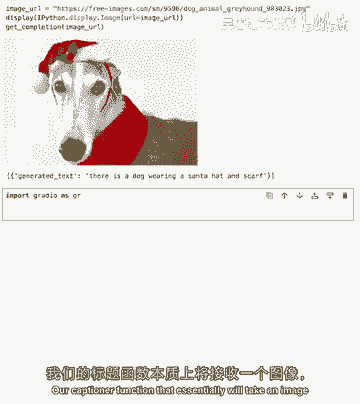 你可以在这里看到它显示,是的,我们可以看到我们拿了这张图片,标题已生成,一只戴着中心隐藏和围巾的狗听起来不错,让我们向您展示如何构建一个无线电接口来构建此图像标题生成应用。