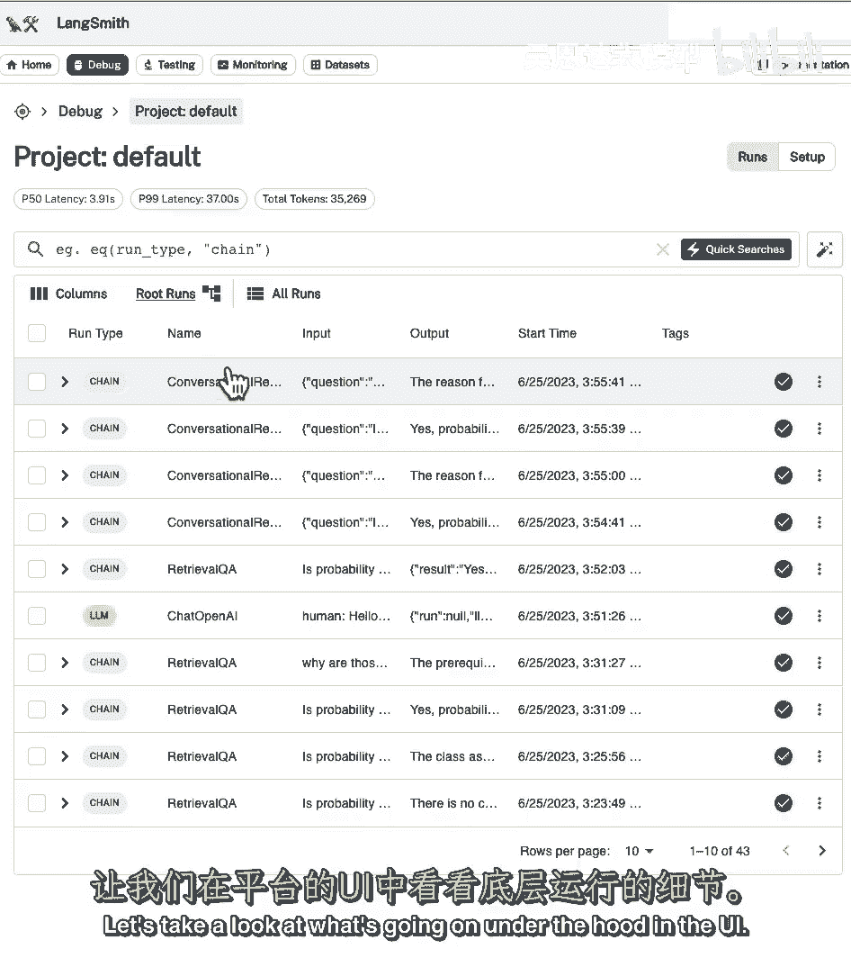 还包括聊天历史,聊天历史来自记忆,并且这在被调用和记录在日志系统之前被应用了,这就是在ui下正在发生的事情,如果我们查看轨迹,我们可以看到有两个不同的事情在进行,首先有一个对项目的调用。