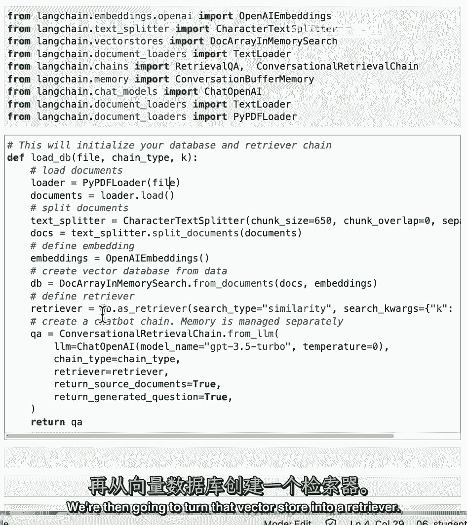 具体来说,这是一个关于,基本上这个整个课程的全面指南,我们将加载数据库和检索器链,我们将传递一个文件,我们将用它的pdf加载器加载它,他们将它加载到文档中,我们将那些文档分割。