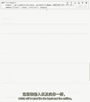让我们称它为n a r,它调用获取完成函数,并返回原始输入文本和模型返回的实体,所以这里我们将进行一个与代码的演示。