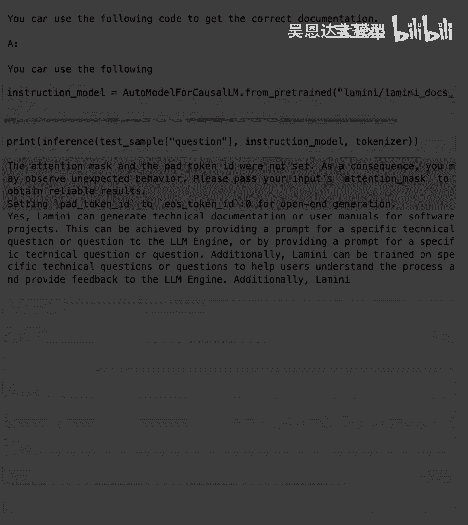 所以我们将给这个模型来自该数据集的问题,可能是测试集中的第一个样本,例如,然后我们可以运行这个,问题是Lamini能否为软件项目生成技术文档或用户手册,实际答案是是的。