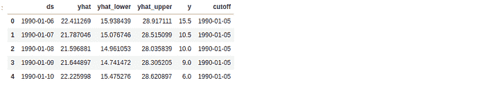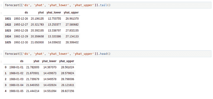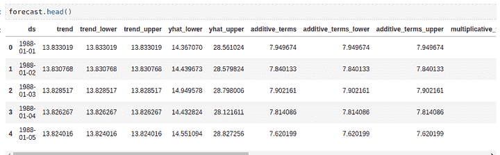 如果我们查看预测数据框的head,会发现它有很多列。然而,我们主要关注ds, yhat, yhat_lower和yhat_upper。yhat是我们的预测值,yhat_lower是我们预测的下限,yhat_upper*是我们预测的上限。