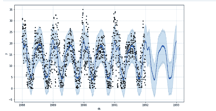 Prophet 具有一个内置功能,允许我们绘制刚刚生成的预测结果。这可以通过使用mode.plot()方法并将我们的预测结果作为参数传递来实现。图中的蓝线表示预测值,而黑点表示我们数据集中的数据。
