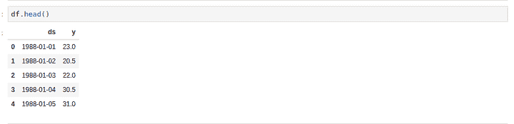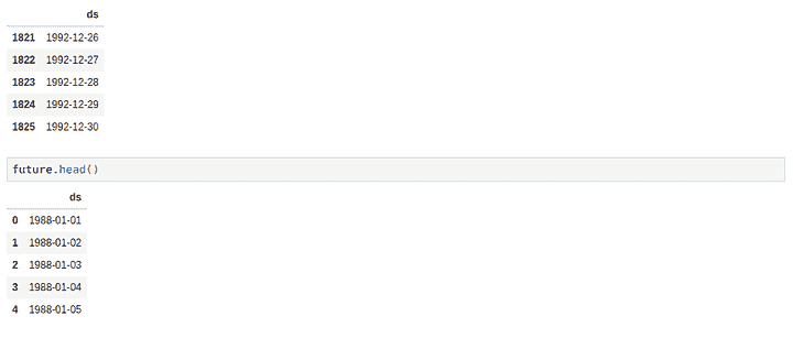 下一步是准备我们的模型进行未来预测。这可以通过使用Prophet.make_future_dataframe方法并传入我们希望预测的天数来实现。我们使用periods属性来指定这个值。这还包括历史日期。我们将使用这些历史日期将预测值与ds列中的实际值进行比较。