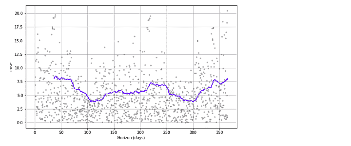 性能指标可以使用plot_cross_validation_metric工具进行可视化。让我们下面可视化 RMSE。