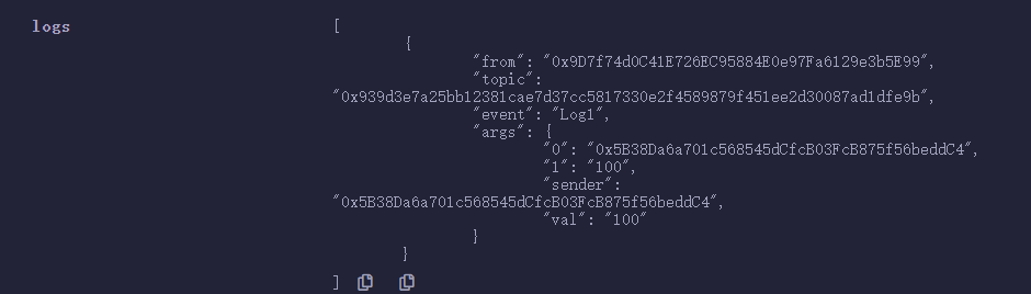 contract EventTest { event Log1(address sender, uint256 val); string log; function test() external{ emit Log1(msg.sender, 100); log = 'logTest'; } }