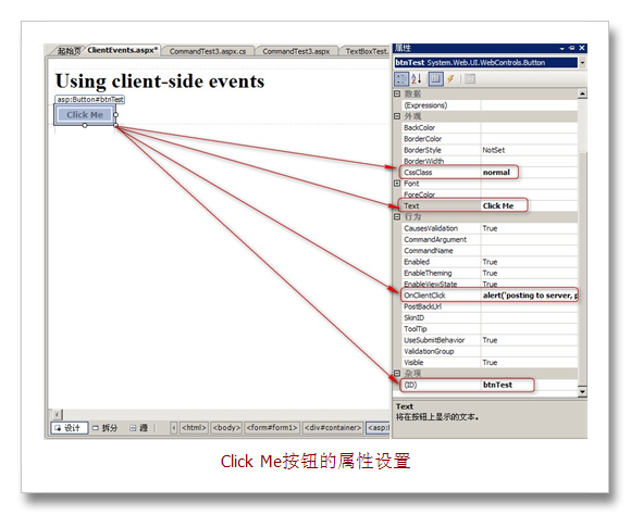 我们通常遇到的一种情况是一个页面有许多相似的按钮,比如将产品列表添加到购物车中。这种情况需用我们使用一个事件处理器来处理不同的按钮的点击事件。这个过程我们需要判断是哪个按钮激发了这Click事件,这就是Command Event。当我们点击按钮后,Click和Command事件都被激发(首先是Click事件),两者的区别在于Command将一些另外的信息通过CommandName和CommandArgument属性传递给Command Event。