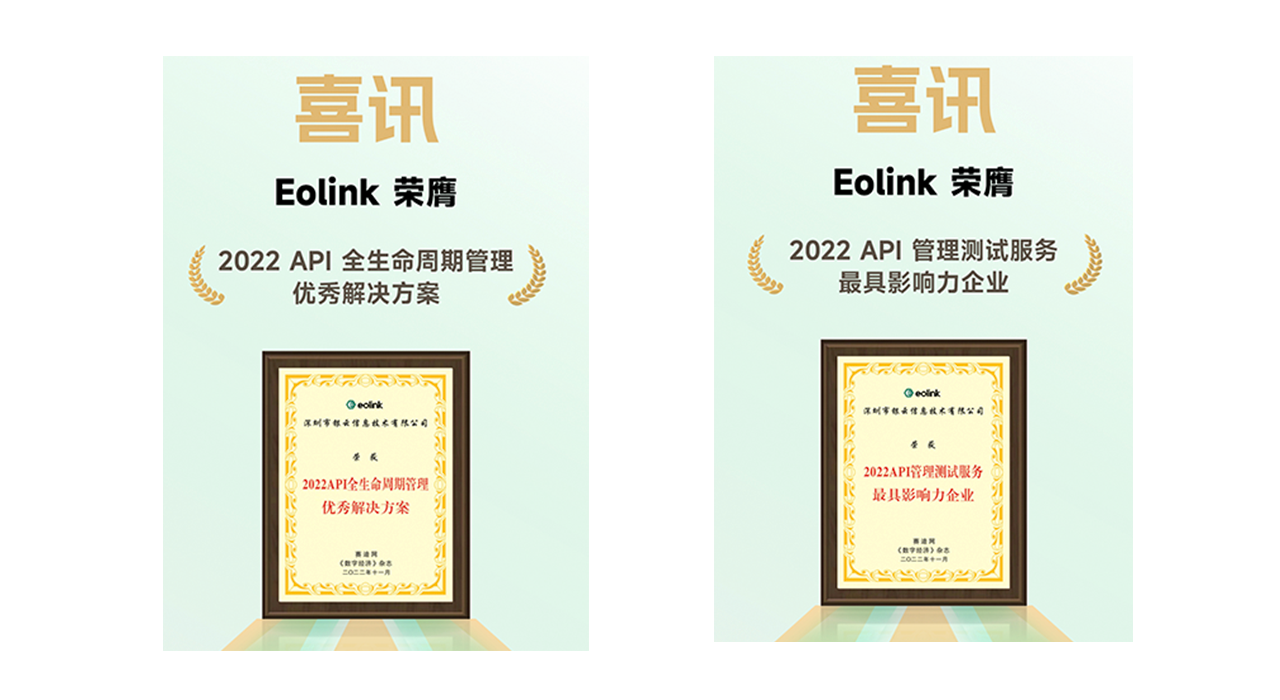 Eolink 以实力荣膺两项大奖 —— 《2022 API 全生命周期管理优秀解决方案》、《2022 API 管理测试服务最具影响力企业》。