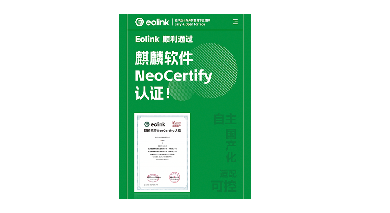 与此同时,跟广大央国企、党政军工组织的用户们同步一下,Eolink 通过了信创环境评估、以及可信云等认证之后,在全面支持国产化方面 Eolink 又迈出了关键一步:目前 Eolink 已顺利通过了麒麟软件 NeoCertify 认证,完美兼容麒麟服务器操作系统的。