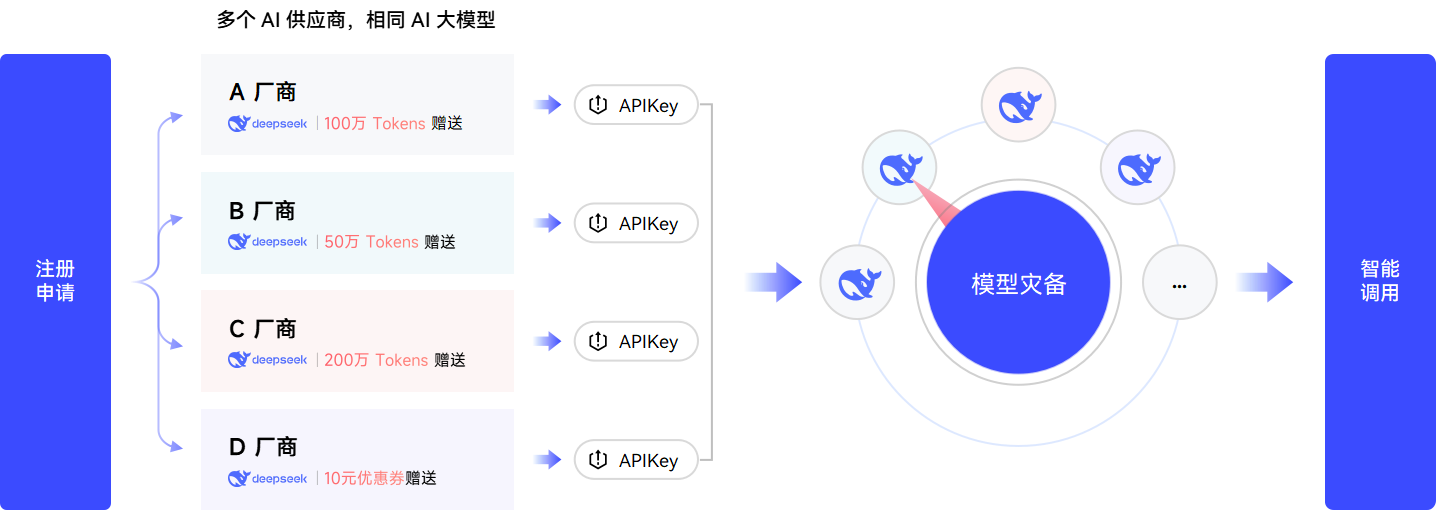多个 AI 供应商同一 AI 大模型集成调用:比如你在 A 平台注册账号获赠 Deepseek 100万 Tokens ,在 B 平台注册账号获得 50万 Tokens 赠送额度;需要把所有平台上关于 Deepseek 的赠送额度都集中调用。