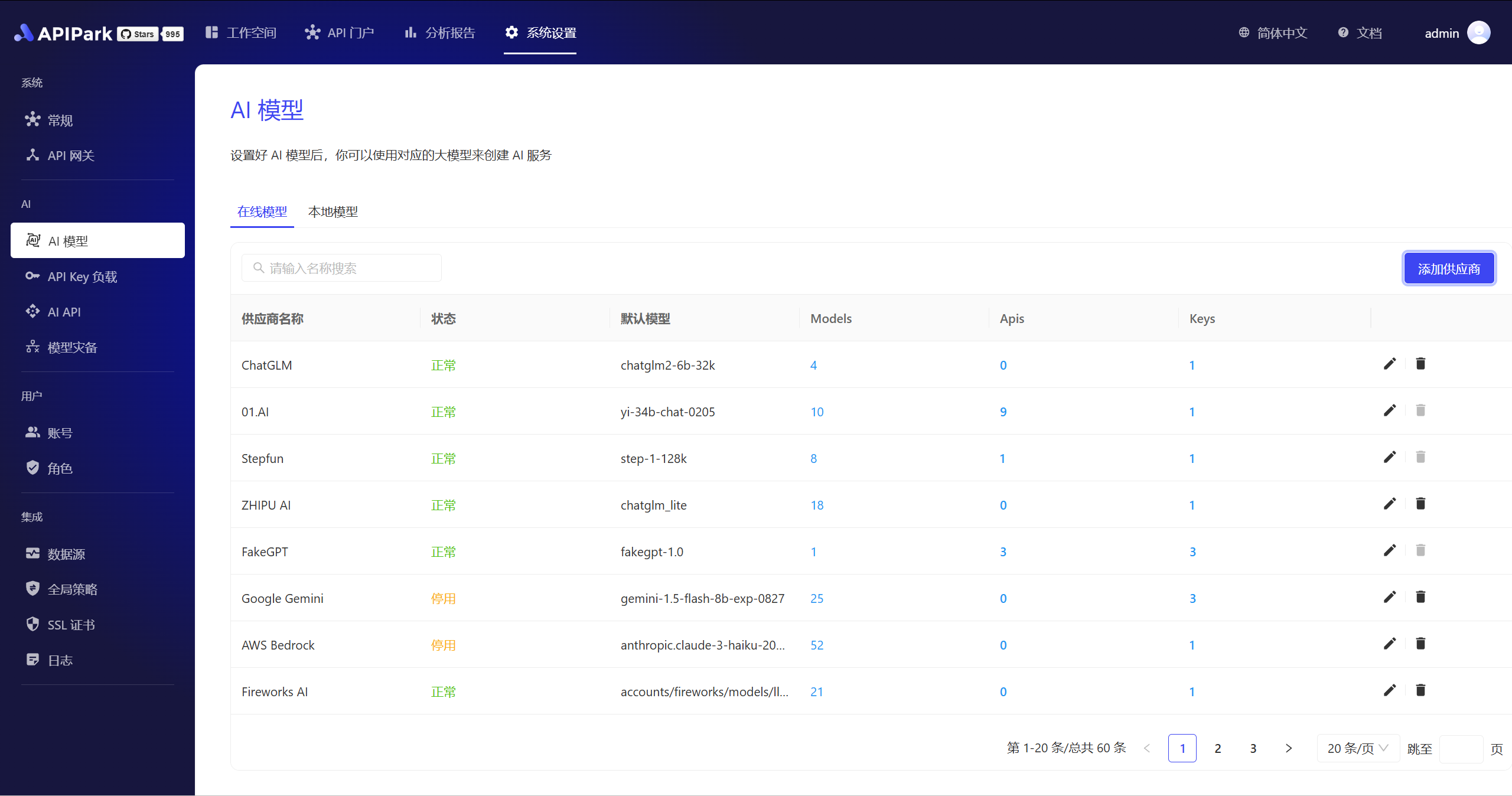 在 「系统设置」 - 「API Key 负载」界面可见你创建的所有 AI 供应商。