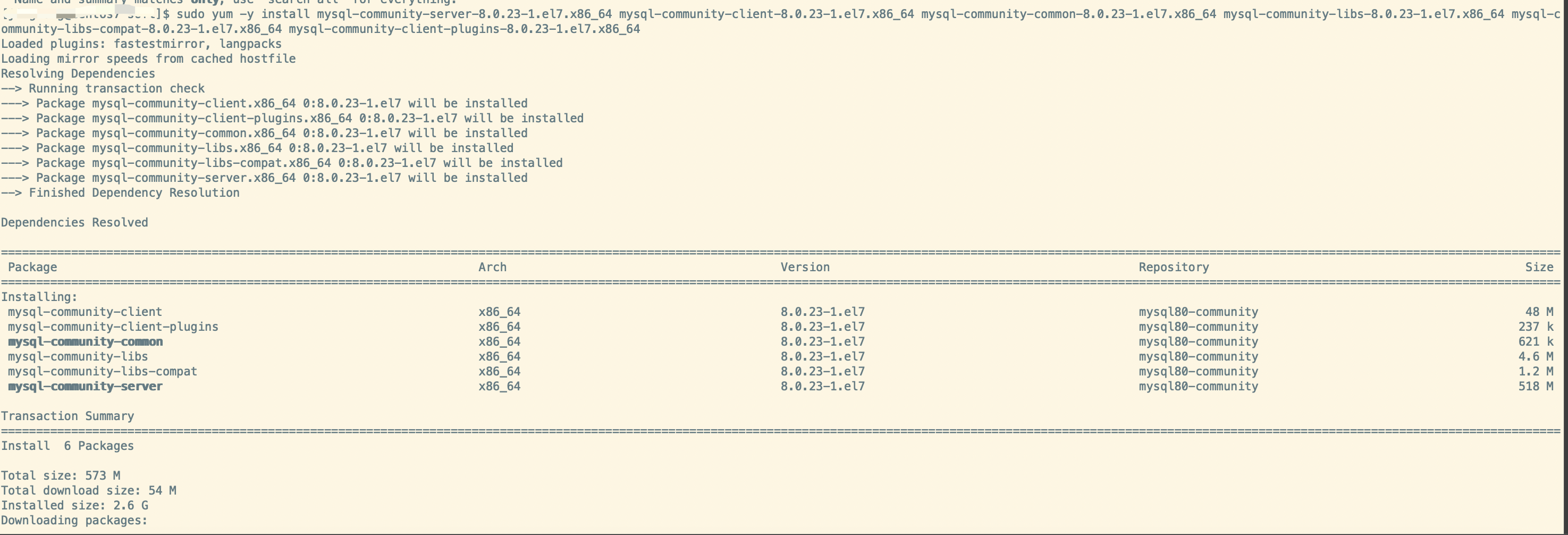 sudo yum -y install mysql-community-server-8.0.23-1.el7.x86_64 mysql-community-client-8.0.23-1.el7.x86_64 mysql-community-common-8.0.23-1.el7.x86_64 mysql-community-libs-8.0.23-1.el7.x86_64 mysql-community-libs-compat-8.0.23-1.el7.x86_64 mysql-community-client-plugins-8.0.23-1.el7.x86_64