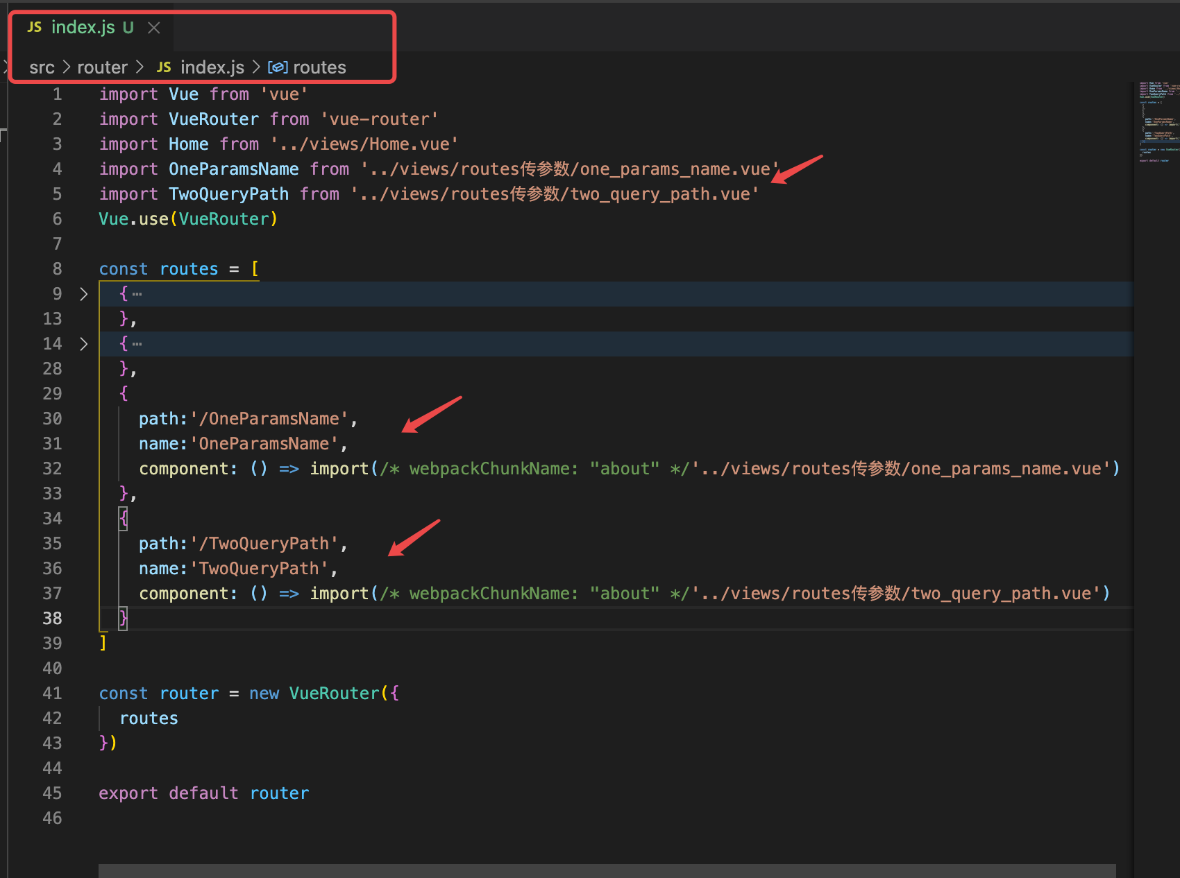 2. 配置一下这2个文件对应的路由,用的是router-link的方式跳转