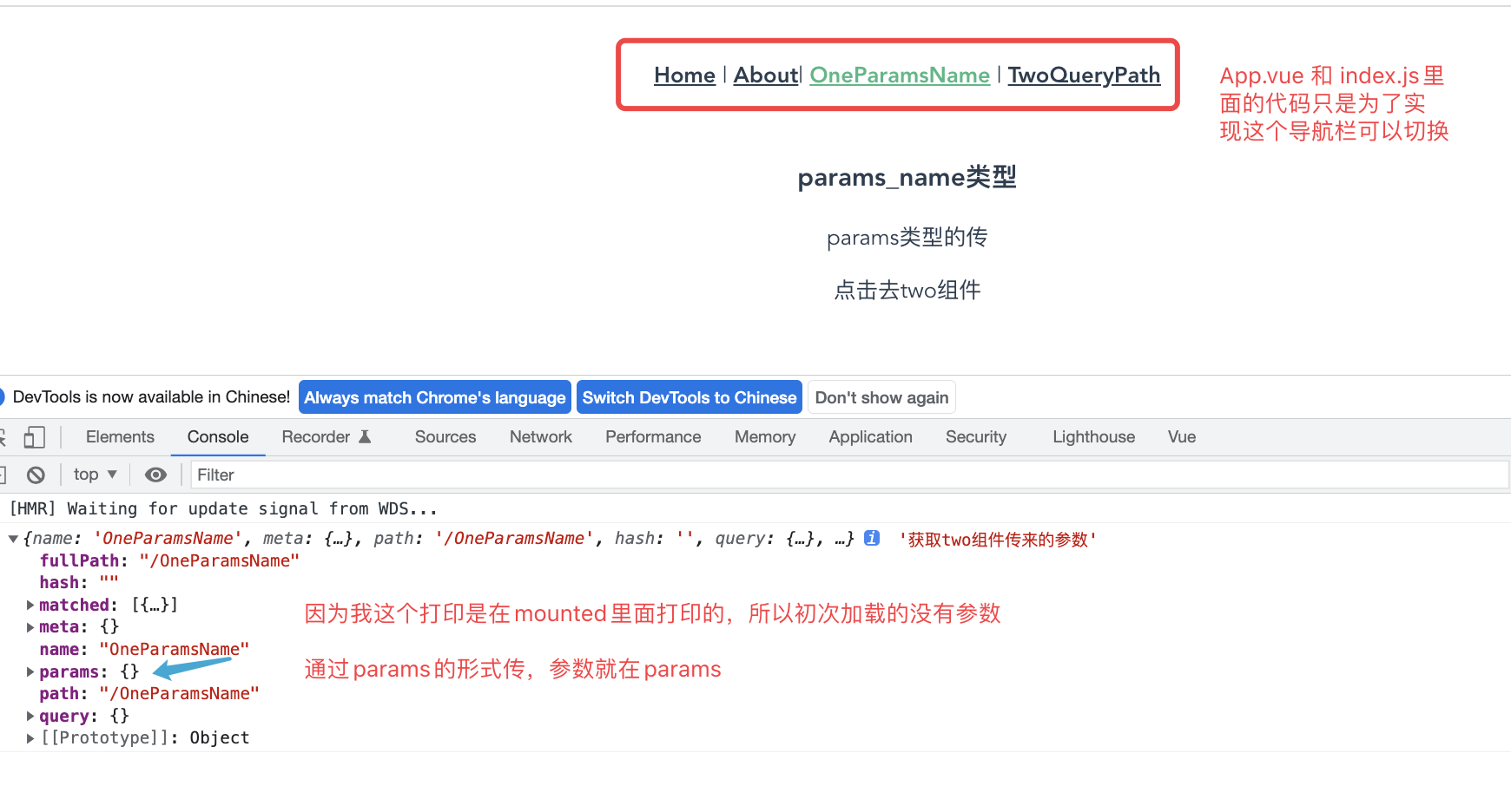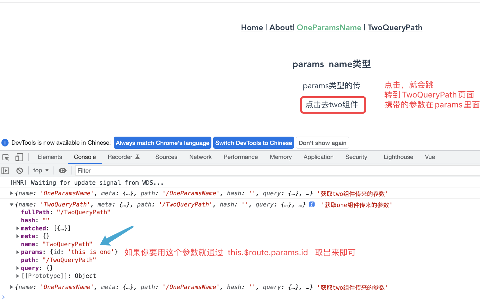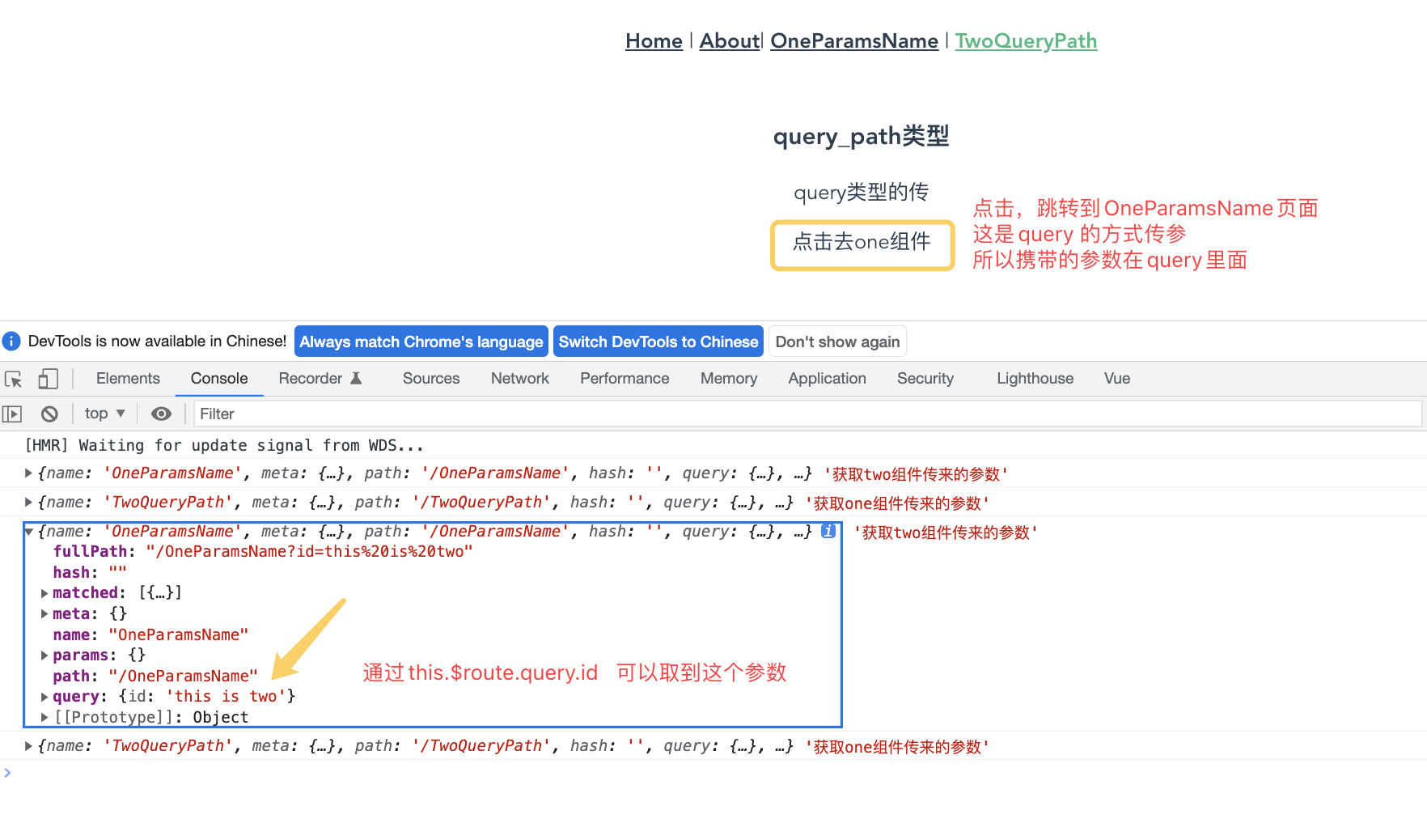 上图说明:携带的参数会带到OneParamsName.vue页面,通过this.$route.query.id 取出来用