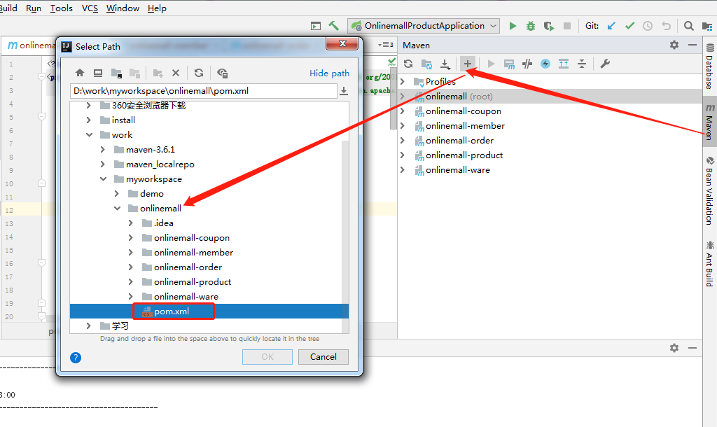 2:把onlinemall项目加入到maven,对onlinemall进行clean操作,其他项目也会一起clean