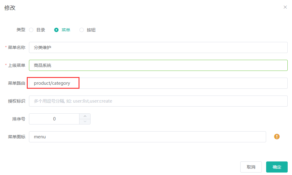 2:菜单的页面存放路径为src\views\modules\product\category.vue