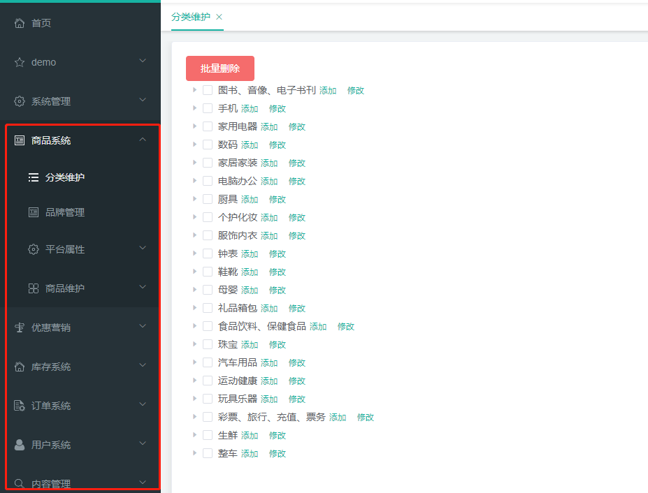 insert into `sys_menu`(`menu_id`,`parent_id`,`name`,`url`,`perms`,`type`,`icon`,`order_num`) values (1,0,'系统管理',NULL,NULL,0,'system',0),(2,1,'管理员列表','sys/user',NULL,1,'admin',1),(3,1,'角色管理','sys/role',NULL,1,'role',2),(4,1,'菜单管理','sys/menu',NULL,1,'menu',3),(5,1,'SQL监控','http://localhost:8080/renren-fast/druid/sql.html',NULL,1,'sql',4),(6,1,'定时任务','job/schedule',NULL,1,'job',5),(7,6,'查看',NULL,'sys:schedule:list,sys:schedule:info',2,NULL,0),(8,6,'新增',NULL,'sys:schedule:save',2,NULL,0),(9,6,'修改',NULL,'sys:schedule:update',2,NULL,0),(10,6,'删除',NULL,'sys:schedule:delete',2,NULL,0),(11,6,'暂停',NULL,'sys:schedule:pause',2,NULL,0),(12,6,'恢复',NULL,'sys:schedule:resume',2,NULL,0),(13,6,'立即执行',NULL,'sys:schedule:run',2,NULL,0),(14,6,'日志列表',NULL,'sys:schedule:log',2,NULL,0),(15,2,'查看',NULL,'sys:user:list,sys:user:info',2,NULL,0),(16,2,'新增',NULL,'sys:user:save,sys:role:select',2,NULL,0),(17,2,'修改',NULL,'sys:user:update,sys:role:select',2,NULL,0),(18,2,'删除',NULL,'sys:user:delete',2,NULL,0),(19,3,'查看',NULL,'sys:role:list,sys:role:info',2,NULL,0),(20,3,'新增',NULL,'sys:role:save,sys:menu:list',2,NULL,0),(21,3,'修改',NULL,'sys:role:update,sys:menu:list',2,NULL,0),(22,3,'删除',NULL,'sys:role:delete',2,NULL,0),(23,4,'查看',NULL,'sys:menu:list,sys:menu:info',2,NULL,0),(24,4,'新增',NULL,'sys:menu:save,sys:menu:select',2,NULL,0),(25,4,'修改',NULL,'sys:menu:update,sys:menu:select',2,NULL,0),(26,4,'删除',NULL,'sys:menu:delete',2,NULL,0),(27,1,'参数管理','sys/config','sys:config:list,sys:config:info,sys:config:save,sys:config:update,sys:config:delete',1,'config',6),(29,1,'系统日志','sys/log','sys:log:list',1,'log',7),(30,1,'文件上传','oss/oss','sys:oss:all',1,'oss',6),(31,0,'商品系统','','',0,'editor',0),(32,31,'分类维护','product/category','',1,'menu',0),(34,31,'品牌管理','product/brand','',1,'editor',0),(37,31,'平台属性','','',0,'system',0),(38,37,'属性分组','product/attrgroup','',1,'tubiao',0),(39,37,'规格参数','product/baseattr','',1,'log',0),(40,37,'销售属性','product/saleattr','',1,'zonghe',0),(41,31,'商品维护','product/spu','',0,'zonghe',0),(42,0,'优惠营销','','',0,'mudedi',0),(43,0,'库存系统','','',0,'shouye',0),(44,0,'订单系统','','',0,'config',0),(45,0,'用户系统','','',0,'admin',0),(46,0,'内容管理','','',0,'sousuo',0),(47,42,'优惠券管理','coupon/coupon','',1,'zhedie',0),(48,42,'发放记录','coupon/history','',1,'sql',0),(49,42,'专题活动','coupon/subject','',1,'tixing',0),(50,42,'秒杀活动','coupon/seckill','',1,'daohang',0),(51,42,'积分维护','coupon/bounds','',1,'geren',0),(52,42,'满减折扣','coupon/full','',1,'shoucang',0),(53,43,'仓库维护','ware/wareinfo','',1,'shouye',0),(54,43,'库存工作单','ware/task','',1,'log',0),(55,43,'商品库存','ware/sku','',1,'jiesuo',0),(56,44,'订单查询','order/order','',1,'zhedie',0),(57,44,'退货单处理','order/return','',1,'shanchu',0),(58,44,'等级规则','order/settings','',1,'system',0),(59,44,'支付流水查询','order/payment','',1,'job',0),(60,44,'退款流水查询','order/refund','',1,'mudedi',0),(61,45,'会员列表','member/member','',1,'geren',0),(62,45,'会员等级','member/level','',1,'tubiao',0),(63,45,'积分变化','member/growth','',1,'bianji',0),(64,45,'统计信息','member/statistics','',1,'sql',0),(65,46,'首页推荐','content/index','',1,'shouye',0),(66,46,'分类热门','content/category','',1,'zhedie',0),(67,46,'评论管理','content/comments','',1,'pinglun',0),(68,41,'spu管理','product/spu','',1,'config',0),(69,41,'发布商品','product/spuadd','',1,'bianji',0),(70,43,'采购单维护','','',0,'tubiao',0),(71,70,'采购需求','ware/purchaseitem','',1,'editor',0),(72,70,'采购单','ware/purchase','',1,'menu',0),(73,41,'商品管理','product/manager','',1,'zonghe',0),(74,42,'会员价格','coupon/memberprice','',1,'admin',0),(75,42,'每日秒杀','coupon/seckillsession','',1,'job',0);