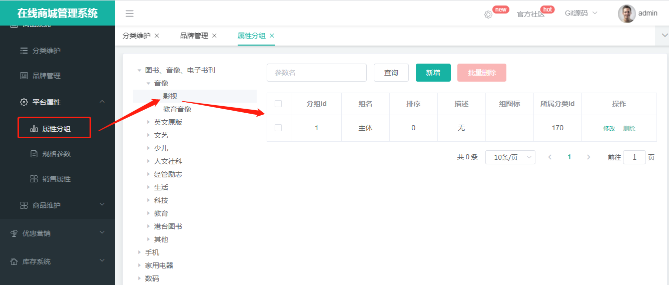 当点击左侧属性分组菜单时,查询所有的属性分组数据