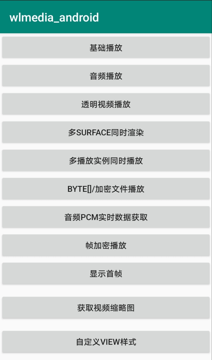 按照上述几个步骤给App工程集成wlmedia后,编译运行wlmedia的demo工程,打开测试App如下图所示,可见wlmedia提供了多种演示功能。
