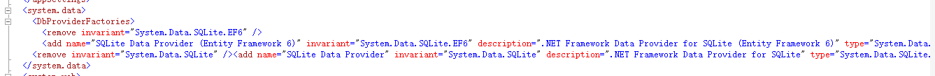 <remove invariant="System.Data.SQLite" /><add name="SQLite Data Provider" invariant="System.Data.SQLite" description=".NET Framework Data Provider for SQLite" type="System.Data.SQLite.SQLiteFactory, System.Data.SQLite" /></DbProviderFactories>