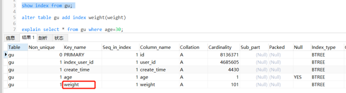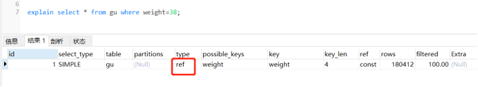 explain select * from user where weitht=’38’;