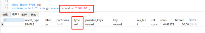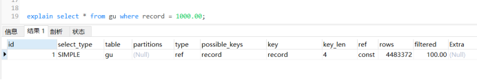 explain select * from gu where record = ‘1000.00’;