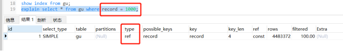 explain select * from gu where record =1000;