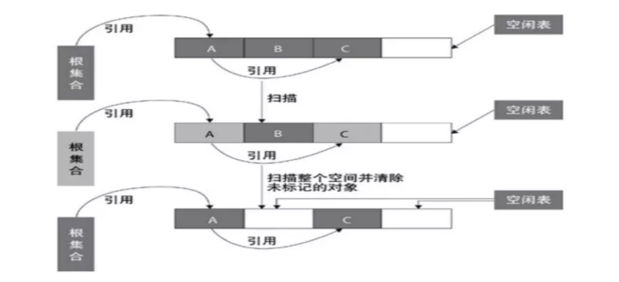 缺点:标记和清除的效率不高;需要一个空闲列表标记出所有的区域和大小,可能会产生大量的内存碎片。