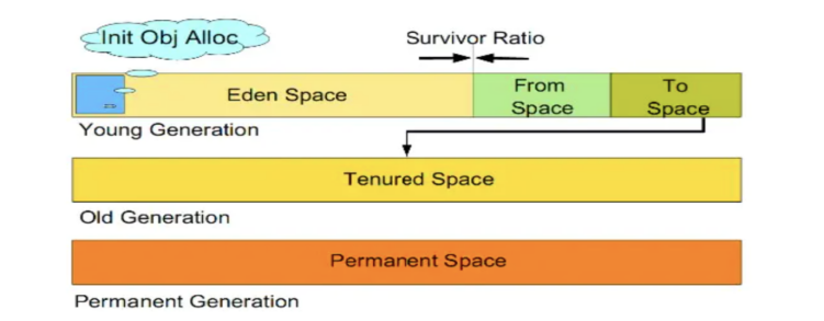 新生代:新生成的对象都是放在新生代中的,新生代进一步划分为eden 区和survivor区;survivor区又分为s1和s2区;eden、s1和s2的大小 默认按照8:1:1的比例进行分配。当对象生成存放eden区,如果eden区空间不够,会触发一次GC过程,将eden区的存活对象复制到s1区,清空eden区;当s1区也储存满时,将eden和s1的存活对象存入s2区;如此在s1和s2区循环,当s2不足以存放eden和s1的对象时,将存活对象存入老年代。存活的对象每经过一次GC,年龄增加1,默认年龄为15时,会将存活对象存入老年代空间。若老年代空间也满时,会触发FULL GC,也就是老年代和新生代都会进行垃圾回收。