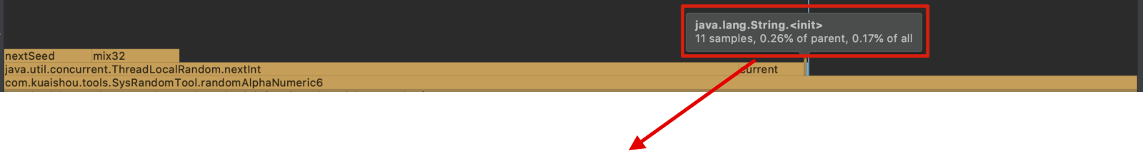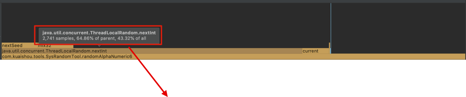 2.根据⽕焰图,随机函数的nextInt()占⽤了64.86%的耗时,说明随机函数是瓶颈