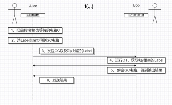 - 将输入的布尔电路做GC和OT算法(详细在下面叙述),得到输出结果。
